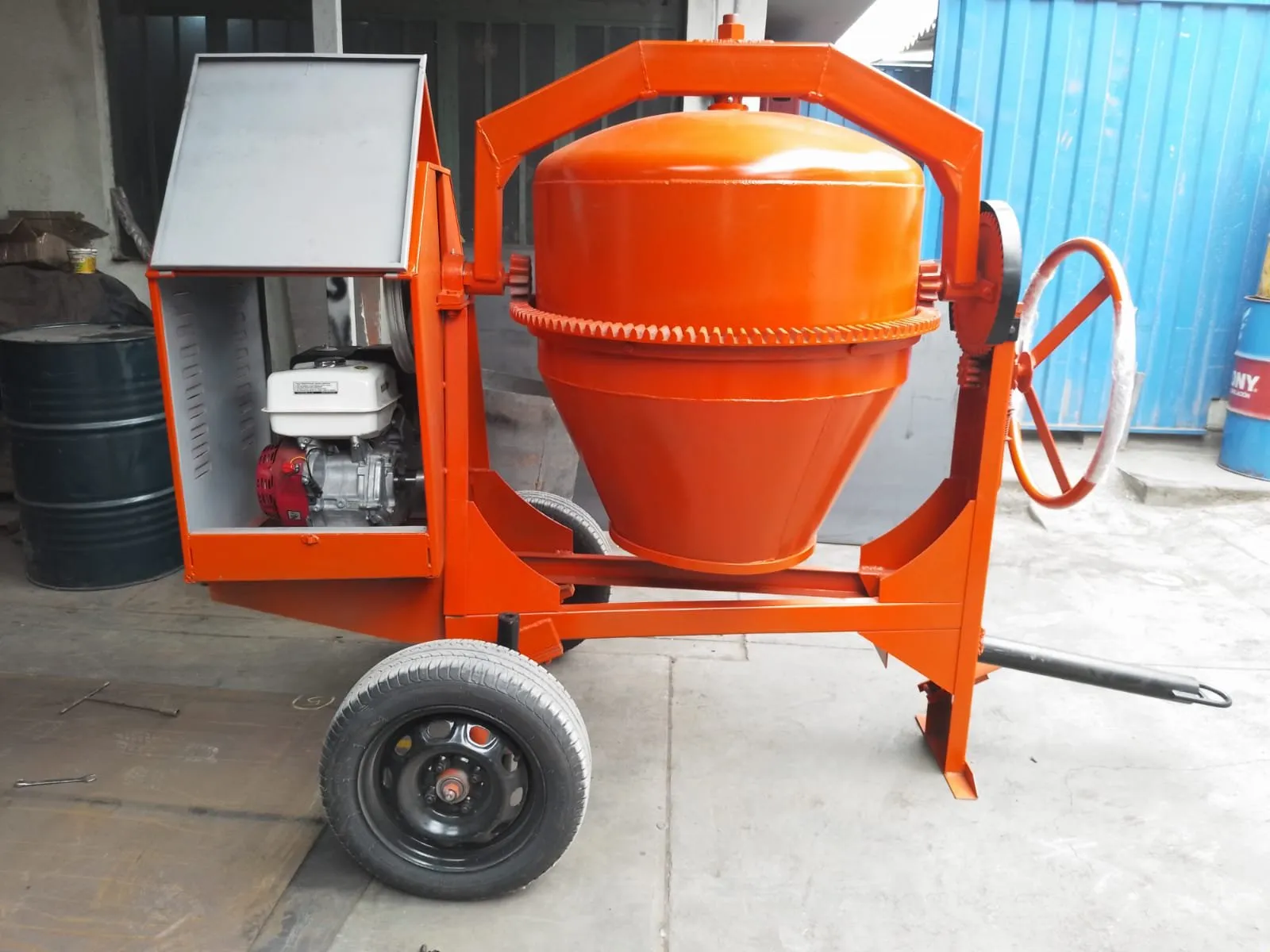 DISEÑADAS PARA LA PREPARACIÓN HOMOGÉNEA, Y MEZCLA DE CONCRETO CON UN FÁCIL MANEJO DE CARGA Y DESCARGA. SON UN EQUIPO ESENCIAL EN LA MECANIZACIÓN DE CUALQUIER OBRA DE CONSTRUCCIÓN. SON MÁS RESISTENTES, Y DE MAYOR DURACIÓN. CUENTA CON 2 LLANTAS ARO 13, UN SOPORTE DE REMOLQUE CON SEGURO, UNA CAJA METÁLICA QUE PROTEGE AL MOTOR DEL PARTÍCULAS Y POLVO, CON 2 PUERTA LATERALES Y CON TIMÓN GIRATORIO PARA GIRAR LA OLLA A 360°, CON UN SEGURO DE PEDAL. LA OLLA TIENE UNA CAPACIDAD DE 11 P3 (BOLSA Y MEDIA DE CEMENTO) CON 3 PALETAS INTERNAS QUE SIRVEN PARA LA MEZCLA HOMOGÉNEA. MAQUINA CON RODAJES DE METAL, QUE NECESITAN SER ENGRASADOS A TRAVÉS DE SUS 6 PUNTOS DE ENGRASE, CADA VEZ QUE VA A TRABAJAR (NO ENGRASAR DIRECTAMENTE EN LOS ENGRANAJES). TIENE UNA PRODUCTIVIDAD DE 6 A 7 MT3 POR HORA APROXIMADAMENTE.